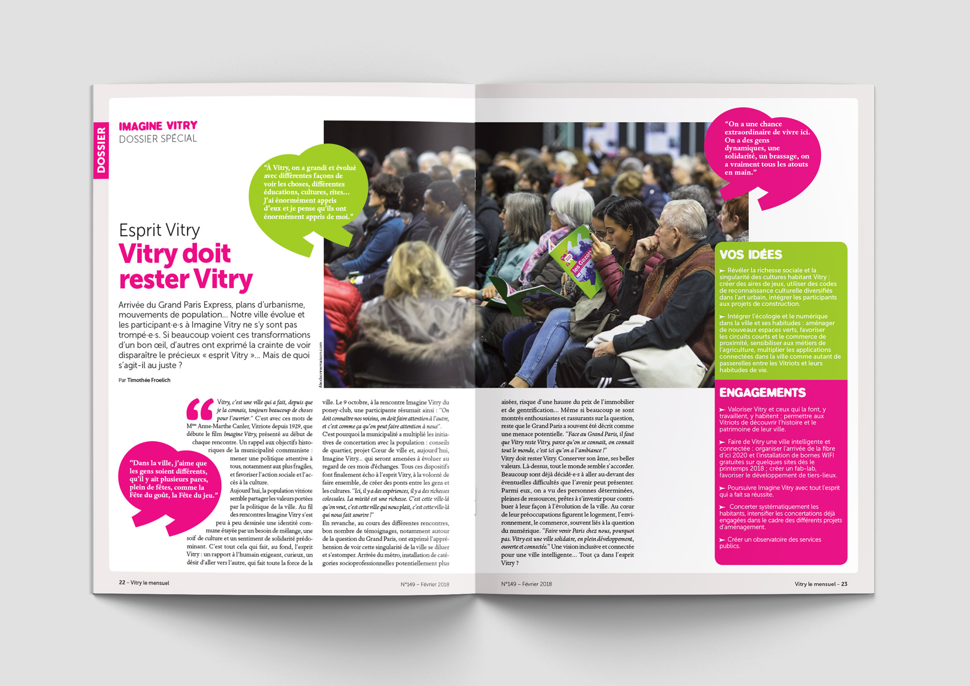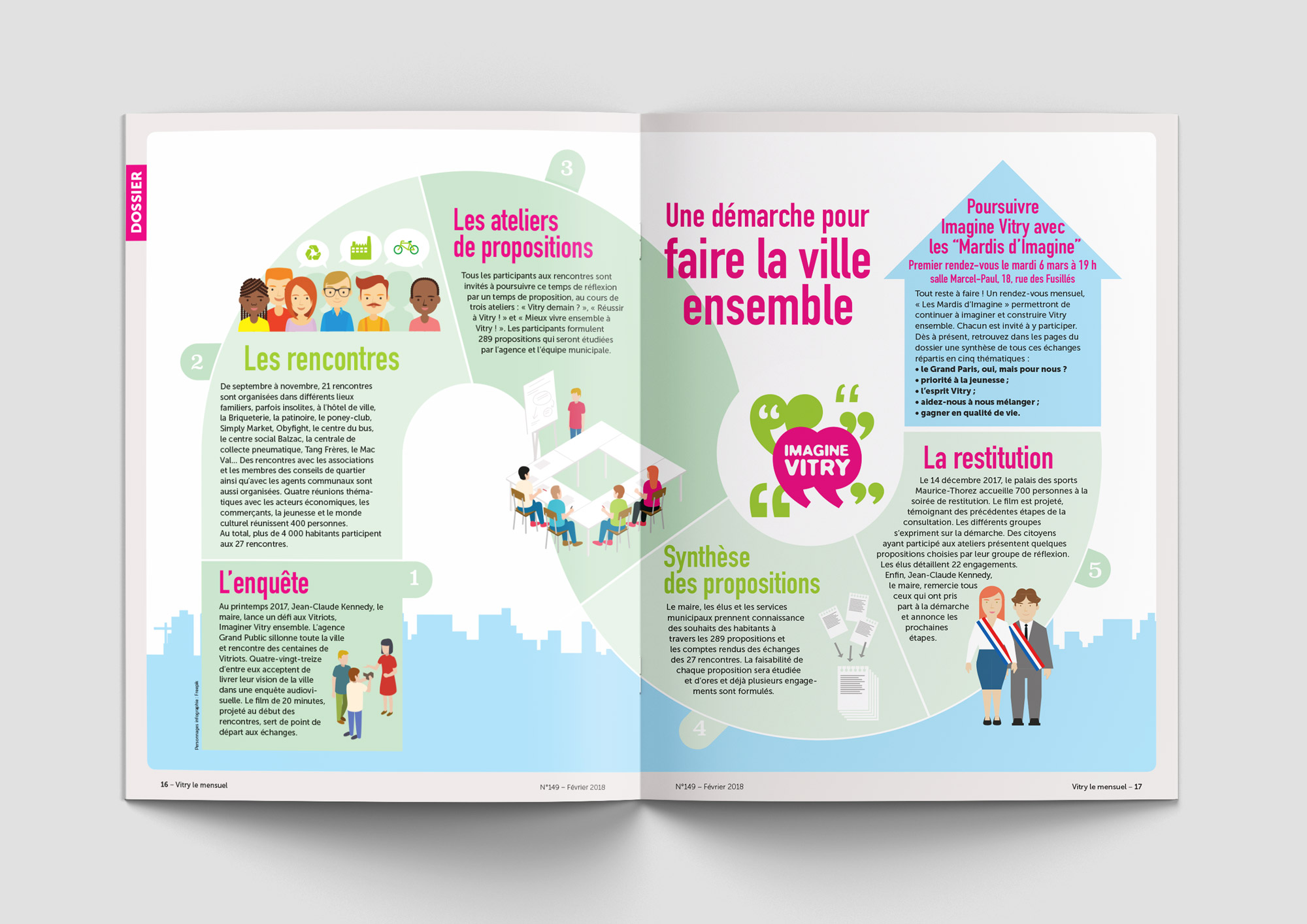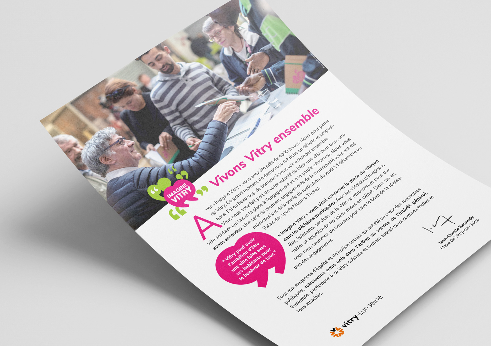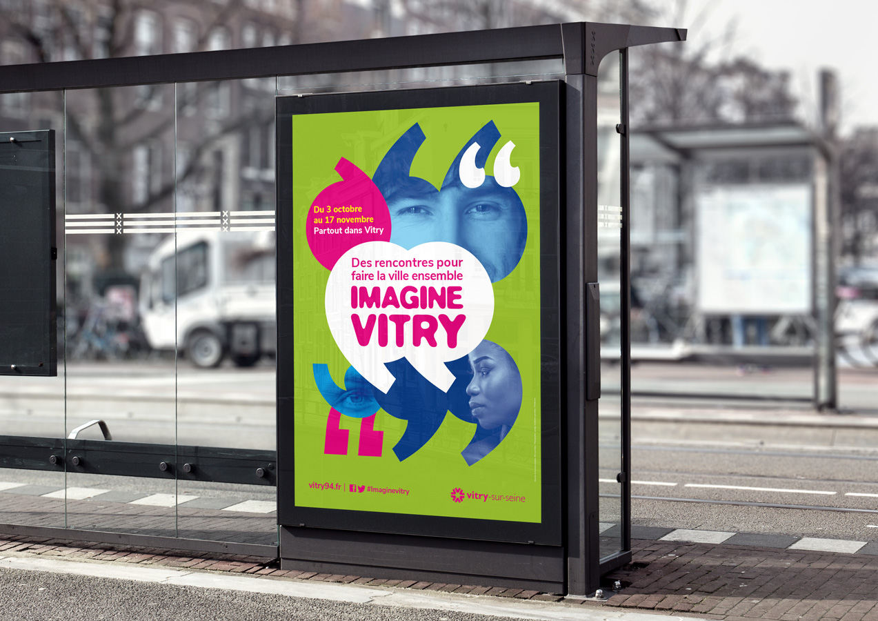 En Automne 2017, la municipalité de Vitry organise un ensemble de rencontres publiques invitant les habitants à échanger sur leur ville. Le projet de communication visuelle a inclut la conception d’une identité graphique permettant d’identifier l’événement et de la conception d’un ensemble de supports de communication print et web.